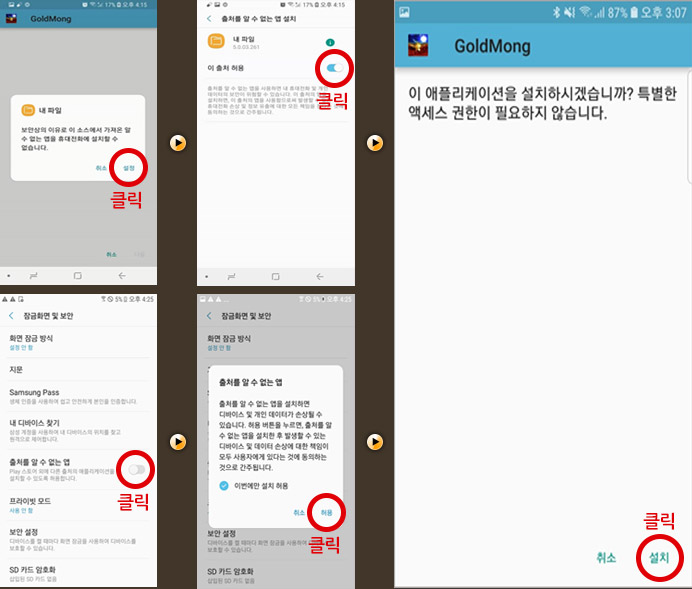 진행하면 설치가 계속 됩니다. 출처를 알 수 없는 앱에 대한 설치 권한 허용 방법은